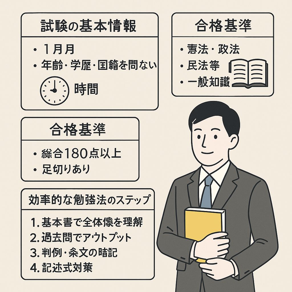 行政書士試験の全体像を初心者向けに解説。試験形式や科目、配点と合格基準、学習時間の目安、独学で合格するための勉強ステップとコツまで、最短合格に必要な情報をまとめました。