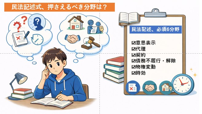 **民法記述で「必ず押さえるべき分野」「書くべき内容」「対策の考え方」**を分かりやすく解説します。